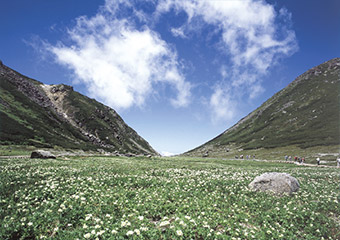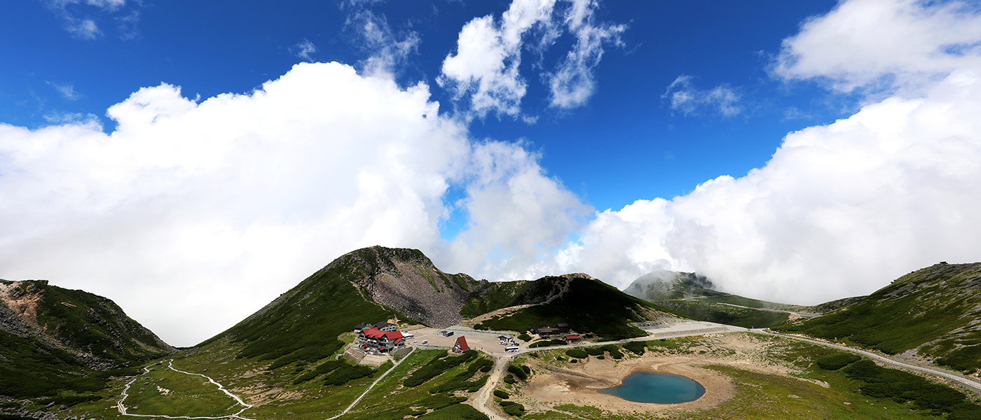 From the summit, you see whole Tatamidaira parking lot. flower field and lakes below. On clear days, you also see a panoramic view of the Northern Japan Alps.